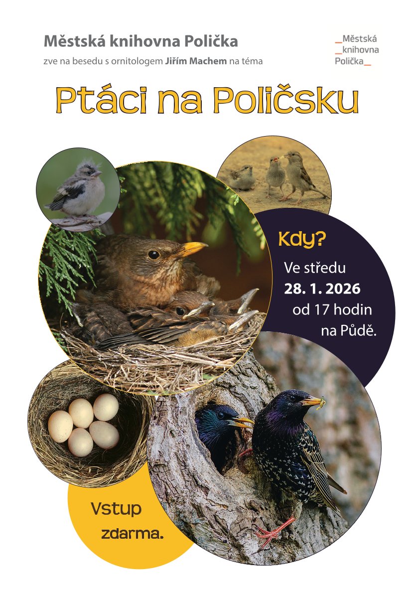 Městská knihovna Polička vás srdečně zve na setkání s ornitologem Mgr. Jiřím Machem na téma: Ptáci na Poličsku, a to ve středu 28. ledna 2026 od 17 hodin.